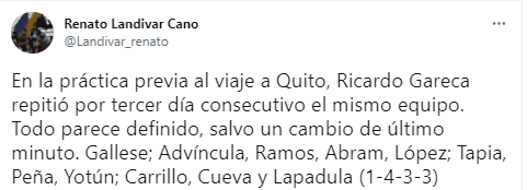 “En la práctica previa al viaje a Quito, Ricardo Gareca repitió por tercer día consecutivo el mismo equipo. Todo parece definido, salvo un cambio de último minuto. Gallese; Advíncula, Ramos, Abram, López; Tapia, Peña, Yotún; Carrillo, Cueva y Lapadula (1-4-3-3)”.