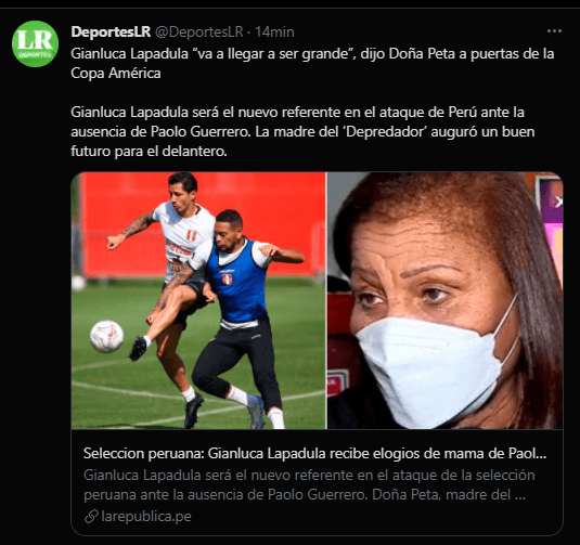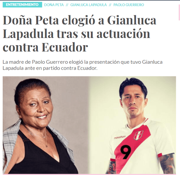 La fiebre por Gianluca Lapadula no es ajena a nadie, ni siquiera a la madre de Paolo Guerrero; Doña Peta. La señora Petronila Gonzales Ganoza, esta vez se refirió al futbolista del momento en la Selección Peruana, con respeto y cercanía, favoreció con elogios al ex AC Milan.