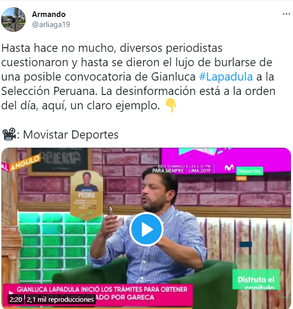 Un grupo de hinchas armó un compilado de los diversos dardos de Pedro García a Gianluca Lapadula. El tiempo no le dio la razón, porque todas las afirmaciones fueron revertidas con las acciones de ‘El Bambino’. Todo lo que mencionó el periodista como deficiencia, lo hizo bien el ex atacante del Benevento. El twitter es así, no te perdona una.