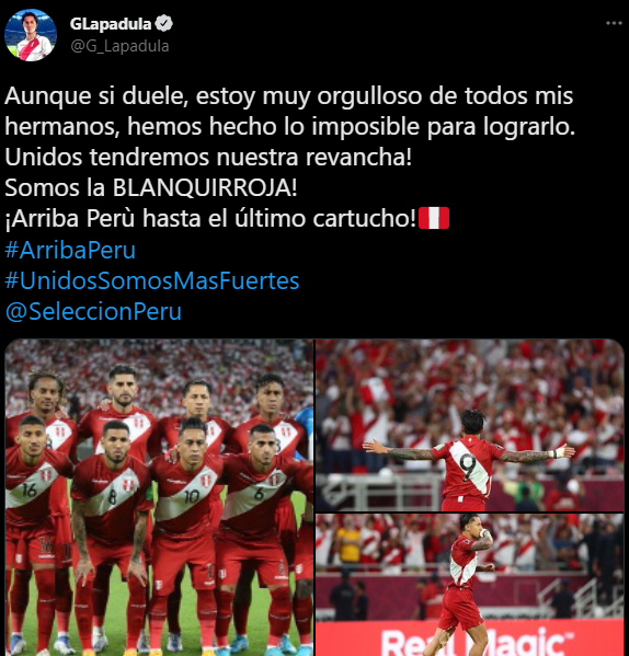 Mediante su cuenta principal de Twitter, en esta oportunidad, reproduciremos lo que colocó ‘El Bambino’ para todos sus seguidores del mundo: “Aunque si duele, estoy muy orgulloso de todos mis hermanos, hemos hecho lo imposible para lograrlo. ¡Unidos tendremos nuestra revancha!”.