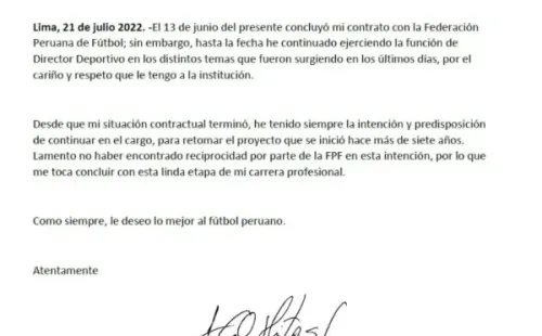 Ahora se puede hacer llamar como ex Director Deportivo de la Federación Peruana de Fútbol. Mediante una carta oficial enviada a los diversos medios de comunicación, mostró su decisión final. En un mensaje reducido, explica su motivo principal para no continuar en el cargo.