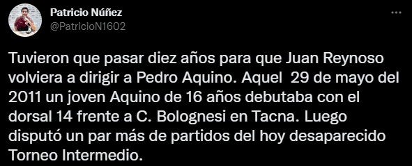 El periodista deportivo peruano, Patricio Núñez, publicó en su cuenta personal la siguiente reseña: “Tuvieron que pasar diez años para que Juan Reynoso volviera a dirigir a Pedro Aquino. Aquel 29 de mayo del 2011 un joven Aquino de 16 años debutaba con el dorsal 14 frente a C. Bolognesi en Tacna. Luego disputó un par más de partidos del hoy desaparecido Torneo Intermedio”.
