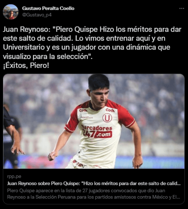 Una verdad absoluta (según los que estuvieron en conferencia de prensa) es la que brindó Juan Reynoso ante los medios de comunicación. De ahí en adelante, podemos debatir para entender cuál es la finalidad de cada acción. La Selección Peruana le da la bienvenida de forma concreta a Piero Quispe, el volante de Universitario de Deportes, fue llamado por el entrenador de ‘La Blanquirroja’.