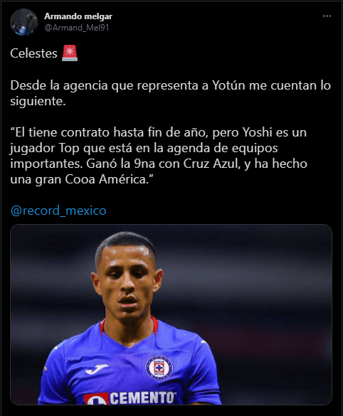 “Él tiene contrato hasta fin de año, pero Yoshi es un jugador Top que está en la agenda de equipos importantes. Ganó la 9na con Cruz Azul, y ha hecho una gran Copa América”. Es la información que existe en este momento, con respecto a ‘Yoshi’ en su presente de transacción.