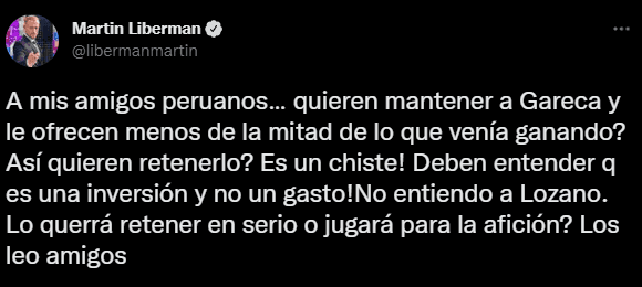 Así lo presentó en su cuenta de Twitter, Martin Liberman, quien fue directo contra los directivos del fútbol peruano: “A mis amigos peruanos ¿Quieren mantener a Gareca y le ofrecen menos de la mitad de lo que venía ganando? ¿Así quieren retenerlo? ¡Es un chiste!”.