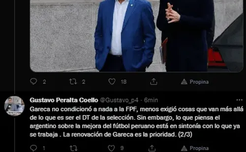Gustavo Peralta detalló, pasó a pasó, lo que sucedió en su cuenta de Twitter: “Atención a la información en PBO Campeonísimo: La renovación de Ricardo Gareca va por buen camino. El “Tigre” y Agustín Lozano, presidente de la FPF, se reunieron hoy y hay buenas sensaciones para encontrar un acuerdo definitivo en las próximas semanas”.