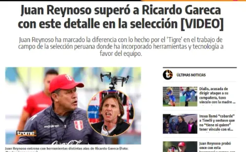 Desde el comienzo hace la comparación que advertimos, con los siguientes paralelos: “Juan Reynoso ya superó a Ricardo Gareca en el número de herramientas dentro del campo de entrenamiento, los ‘Alemanes de Bielsa’ (muñecos Inflables en la defensa), jugadores de plástico para simular una barrera defensiva, rebotadores para los pases en primera y los pequeños arcos para afinar la puntería a la hora de la definición”.