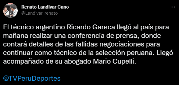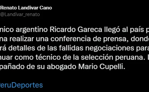 “El técnico argentino Ricardo Gareca llegó al país para mañana realizar una conferencia de prensa, donde contará detalles de las fallidas negociaciones para continuar como técnico de la selección peruana. Llegó acompañado de su abogado Mario Cupelli”. Fue lo que comentó el comunicador social, junto a la fotografía donde se le ve saliendo en grupo, con otras personas del mismo vuelo.