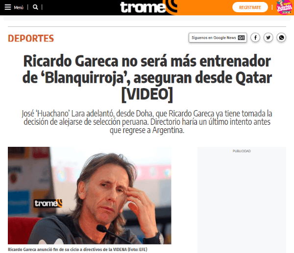 El responsable de lo que leerán a continuación, cae bajo la responsabilidad del periodista deportivo, José Lara: “Se acabó la esperanza de ir a nuestro segundo mundial consecutivo. Hasta acá llegó esta aventura, es imposible no quebrarse y hasta aquí llega el ciclo de Ricardo Gareca, porque ya no será más el técnico de la selección peruana”.