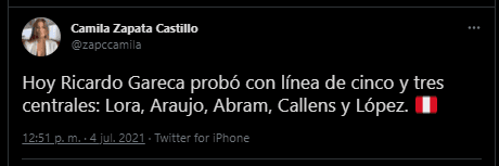 “Hoy Ricardo Gareca probó con línea de cinco y tres centrales: Lora, Araujo, Abram, Callens y López”. Evidentemente esta no será la línea defensiva titular delante del portero Pedro Gallese. Pero es un detalle para tomar en cuenta, porque pueden haber cambios.