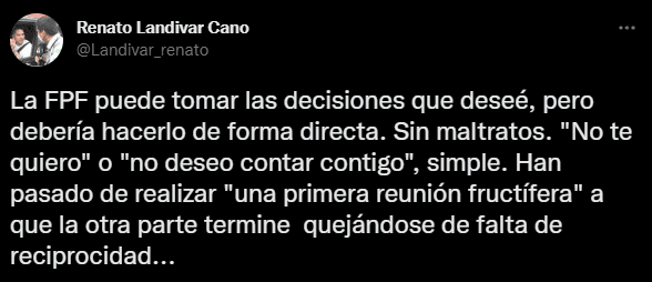 “La FPF puede tomar las decisiones que deseé, pero debería hacerlo de forma directa. Sin maltratos. “No te quiero” o “no deseo contar contigo”, simple. Han pasado de realizar “una primera reunión fructífera” a que la otra parte termine quejándose de falta de reciprocidad”. Presentó, haciéndose viral porque tiene mucha razón.