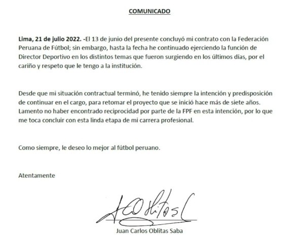 Y ahora, por algo parecido, semejante, de manera casi calcada. Juan Carlos Oblitas oficialmente dejó el cargo como Director Deportivo de la Federación Peruana de Fútbol, mediante una carta donde se despedía de todos los encargados. Denunciando de pasada, incompatibilidad de caracteres, palabras más, palabras menos.