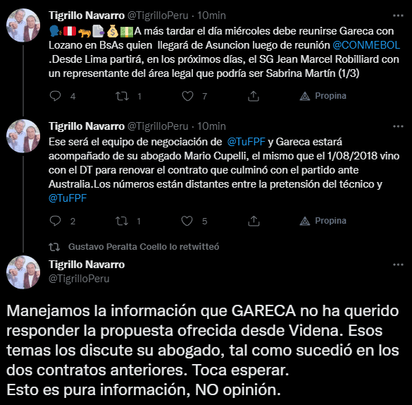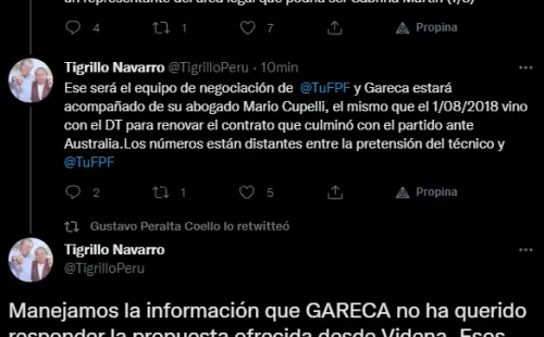 Con este mensaje en su cuenta de Twitter, Carlos Alberto Navarro empezó el día: “A más tardar el día miércoles debe reunirse Gareca con Lozano en Buenos Aires, quien llegará de Asunción luego de reunión CONMEBOL. Desde Lima partirá, en los próximos días, el SG Jean Marcel Robilliard con un representante del área legal que podría ser Sabrina Martín”.