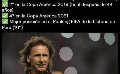 Recurrimos a la cuenta oficial de ‘SofaScore Latin America’, que propuso un tema coyuntural para el ambiente sudamericano. Porque la partida de Ricardo Gareca es eso, una novedad absoluta. Todos lo tenían prácticamente cerrado, continuando con nosotros. Así va el titular de la información: “Ricardo Gareca con la Selección de Perú”.