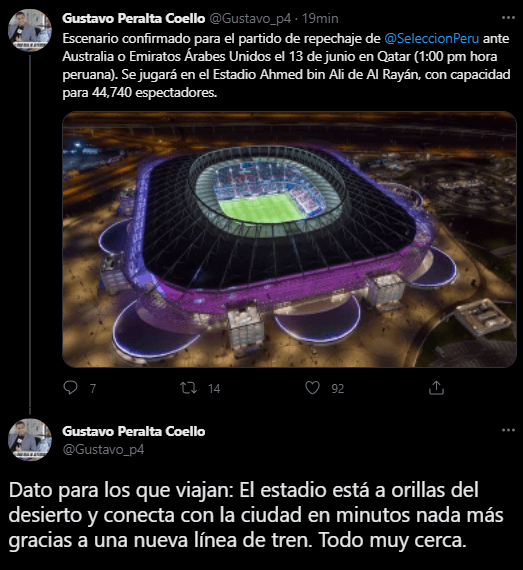Para mayor detalles, encontramos unos mensajes de Gustavo Peralta de ESPN Perú, quien explica algunos puntos sueltos: “Escenario confirmado para el partido de repechaje de la Selección Peruana ante Australia o Emiratos Árabes Unidos el 13 de junio en Qatar (1:00 pm, hora peruana). Se jugará en el Estadio Ahmed bin Ali de Al Rayán, con capacidad para 44,740 espectadores”.