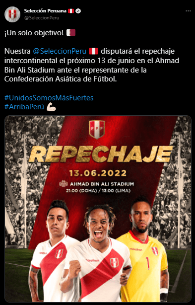 Así fue como la Federación Peruana de Fútbol, en su cuenta de Twitter, notificó la información anticipada “¡Un solo objetivo! Nuestra Selección Peruana disputará el repechaje intercontinental el próximo 13 de junio en el Ahmad Bin Ali Stadium ante el representante de la Confederación Asiática de Fútbol”.