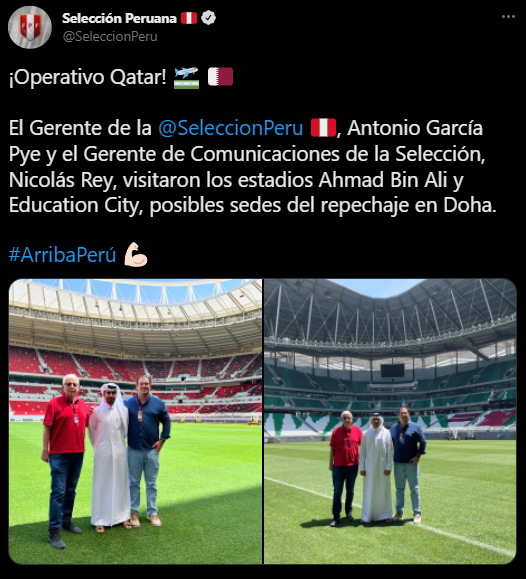 Mediante sus cuentas oficiales en redes sociales, la Selección Peruana realizó la siguiente publicación: “El Gerente de la selección peruana, Antonio García Pye, y el Gerente de Comunicaciones de la Selección, Nicolás Rey, visitaron los estadios Ahmad Bin Ali y Education City, posibles sedes del repechaje en Doha”.