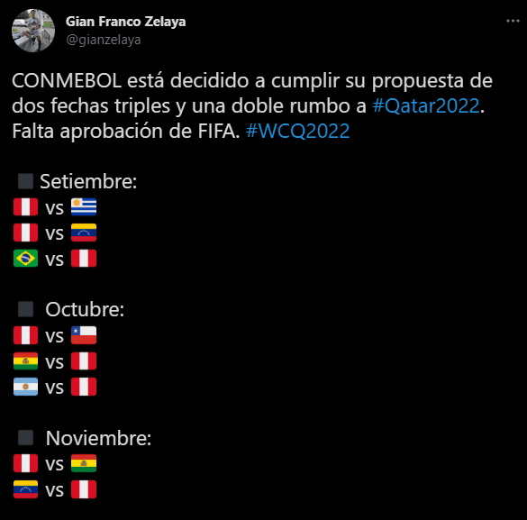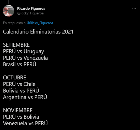 El calendario de ‘Las Eliminatorias Sudamericanas para Catar 2022’ estaría quedando de la siguiente manera. Comenta el periodista Ricaardo Figueroa: “SETIEMBRE- PERÚ vs Uruguay. PERÚ vs Venezuela. Brasil vs PERÚ.OCTUBRE – PERÚ vs Chile. Bolivia vs PERÚ. Argentina vs PERÚ.NOVIEMBRE -PERÚ vs Bolivia. Venezuela vs PERÚ”.
