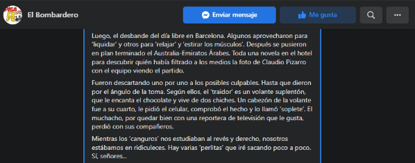 De esta manera comenzó su relato: “Luego, el desbande del día libre en Barcelona. Algunos aprovecharon para ‘liquidar’ y otros para ‘relajar’ y ‘estirar los músculos’. Después se pusieron en plan terminado el Australia-Emiratos Árabes. Toda una novela en el hotel para descubrir quién había filtrado a los medios la foto de Claudio Pizarro con el equipo viendo el partido”.