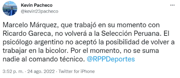 “Marcelo Márquez, que trabajó en su momento con Ricardo Gareca, no volverá a la Selección Peruana. El psicólogo argentino no aceptó la posibilidad de volver a trabajar en la bicolor. Por el momento, no se suma nadie al comando técnico”, reveló el periodista Kevin Pacheco en RPP Noticias.