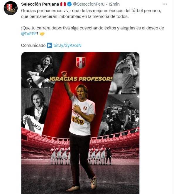 “Gracias por hacernos vivir una de las mejores épocas del fútbol peruano, que permanecerán imborrables en la memoria de todos. “¡Que tu carrera deportiva siga cosechando éxitos y alegrías es el deseo de la Selección Peruana!”, publicó las redes oficiales de la Selección Peruana de Fútbol.