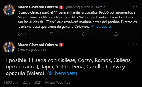 “Ricardo Gareca paró el 11 para enfrentar a Ecuador: Probó por momentos a Miguel Trauco x Marcos López y a Álex Valera por Gianluca Lapadula. Esas son las dudas del “Tigre” que resolverá mañana antes del partido. El resto es la misma base que viene de ganar a Colombia”. Precisó el periodista deportivo.