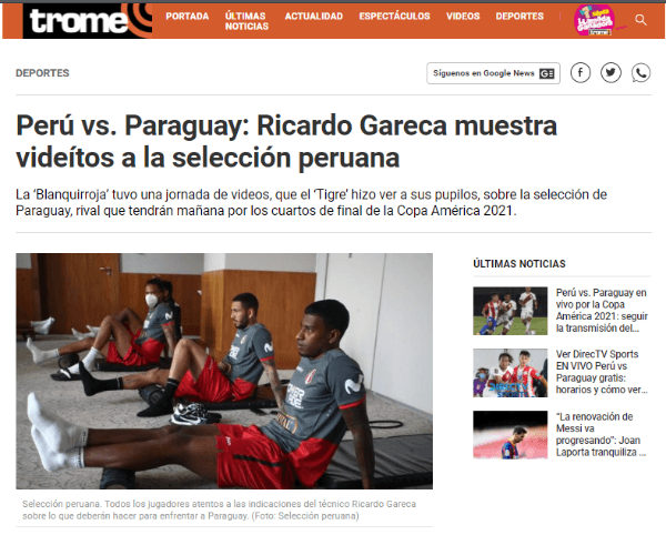 Según cuenta ‘El Diario Trome’, Ricardo Gareca está metido de lleno en el partido contra Paraguay, quiere que su ‘Blanquirroja’ se imponga de manera inmediata a ‘La Albirroja’. Por eso está incluyendo vídeos para analizar junto a sus jugadores al rival de turno. Este es un extracto de la versión web del conocido periódico, donde cuenta este hecho.