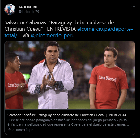 Se le consultó por el mejor futbolista de Perú, y Cabañas no lo dudó dos veces para señalarlo: “Sí, todos sabemos que debemos cuidarnos de Christian Cueva. Tiene muy buena técnica, es un gran jugador y lo está demostrando con su selección. Perú tiene una buena selección, pero confiamos en lo que hará mi selección, Paraguay”.