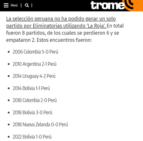 Lo cual no se pasó por alto por los diversos personajes dentro del balompié nacional. Porque hay números que no terminan siendo positivos cuando se trata de ver a nuestra ‘Blanquirroja’, vestida de color entero. Así lo referencia el medio de comunicación conocido como ‘Diario Trome’.
