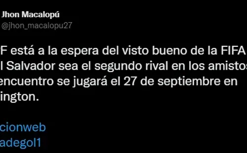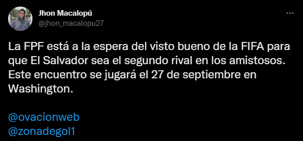 Lo que menciona el comunicador social es muy claro, vamos a ello ahora mismo, para poder analizar después con calma: “La FPF está a la espera del visto bueno de la FIFA para que El Salvador sea el segundo rival en los amistosos. Este encuentro se jugará el 27 de septiembre en Washington”. Con lo entregado, podemos señalar que hay una chance enorme, casi confirmada, de poder chocar contra otro combinado centroamericano.