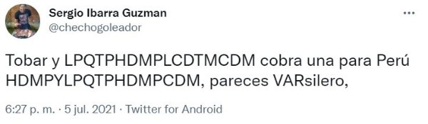 Aunque, en una seguidilla de malas decisiones del árbitro chileno Roberto Tobar, los jugadores peruanos reclamaban que solo estaba cobrando a favor de Brasil. Esta queja se trasladó a las redes sociales y Sergio ‘Checho’ Ibarra desató toda su ira en Twitter.