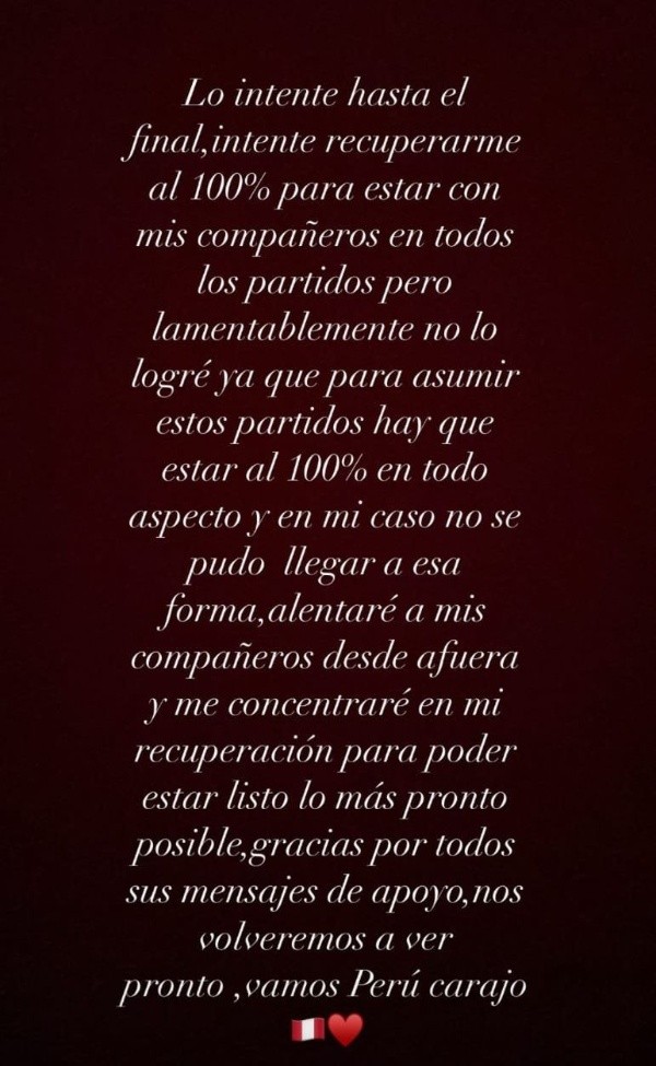 El volante de la Selección Peruana escribió en su Instagram unas sentidas palabras tras su desconvocatoria de la ‘bicolor’: “Lo intenté hasta el final, intenté recuperarme al 100% para estar con mis compañeros en todos los partidos, pero lamentablemente no lo logré ya que para asumir estos partidos hay que estar al 100% en todo aspecto y en mi caso no se pudo llegar a esa forma, alentaré a mis compañeros desde afuera y me concentraré en mi recuperación para poder estar listo lo más pronto posible, gracias por todos sus mensajes de apoyo, nos volveremos a ver pronto, vamos Perú carajo”, publicó Sergio Peña.
