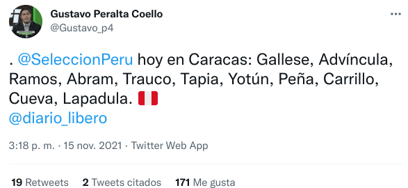 Este lunes, de hecho, Ricardo Gareca paró el siguiente once en el entrenamiento en Caracas:Gallese, Advíncula, Ramos, Abram, Trauco, Tapia, Yotún, Peña, Carrillo, Cueva, Lapadula. La información la dio Gustavo Peralta de Líbero y confirma el equipo del que se habló este domingo. Tenemos que decirlo: ¡confiamos en los elegidos!