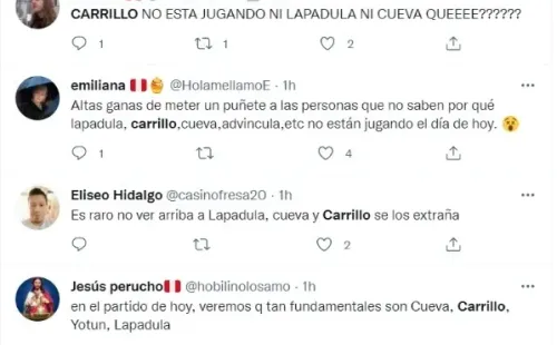 Los aficionados de la ‘blanquirroja’ se sorprendieron al no ver a las principales figuras de la Selección Peruana y reaccionaron en las redes sociales reclamando la ausencia de algunos futbolistas: “No está jugando ni Lapadula ni Cueva queeee?????”, “Es raro no ver arriba a Lapadula, Cueva y Carrillo, se les extraña”, “En el partido de hoy veremos que tan fundamentales son Cueva, Carrillo, Yotún y Lapadula”, comentaron algunos hinchas.