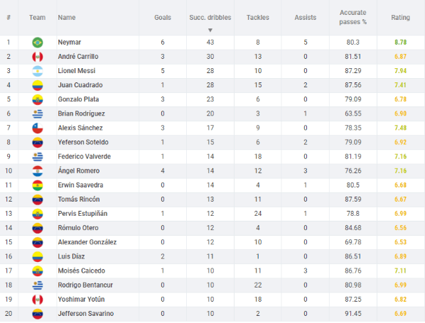 Lionel Messi (Argentina), Juan Guillermo Cuadrado (Colombia), Alexis Sánchez (Chile), Luis Díaz (Colombia), Rómulo Otero (Venezuela), y otros más. Un lujo ver a André Carrillo por encima de todos ellos, esperemos que siga desarrollando esta habilidad entregada solo a él. Nuestra ‘Culebra’.