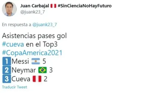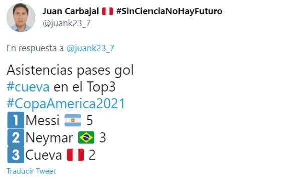Christian Cueva, con dos asistencias en toda la Copa América,es el tercero en el podio de máximos asistidores. Siendo sobrepasado solo por Neymar, con 3 pases gol, y Lionel Messi, con 5, el volante se codea con los grandes. Los problemas, y las criticas hacia el jugador del Al-Fateh, no fueron impedimento para que el ‘10’ de la Selección Peruana pueda demostrar su nivel en el certamen.