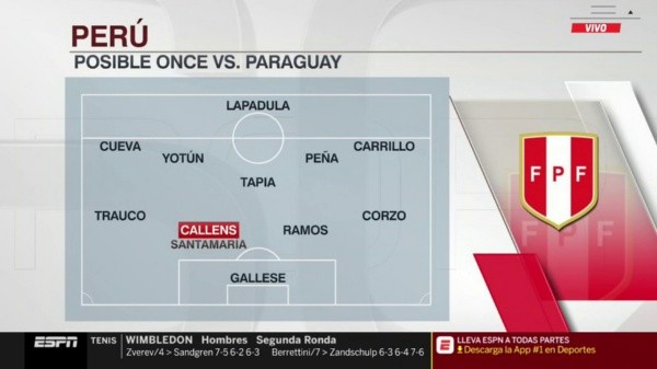 Este jueves, en ese sentido, ESPN adelantó un posible equipo titular de la Selección Peruana. Según su gráfica, solo habría una duda en el equipo de todos y pasaría por el puesto de posición central. Recordemos que Alexander Callens salió sentido el último encuentro. Igual, no parecía de gravedad.
