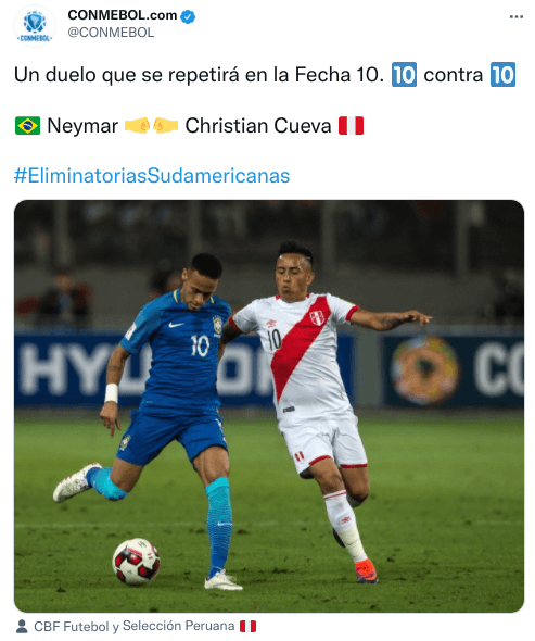 En la previa, hizo un posteo sobre la fecha 10 y puso a dos enganches en una foto: Cueva y Neymar. “Un duelo que se repetirá en la Fecha 10. 10 contra 10”, escribieron en la publicación. Acá les dejamos la captura ¡Tremenda comparación!