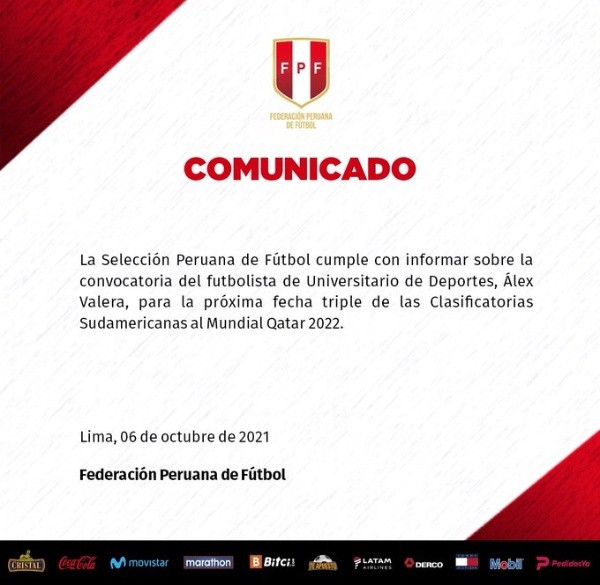 Por ello, y a pesar de aún tener más de 23 disponibles, Ricardo Gareca hizo un llamado de urgencia este miércoles cerca al mediodía que fue oficializado por la cuenta oficial de la Selección. Llamaron a Alex Valera de Universitario de Deportes.