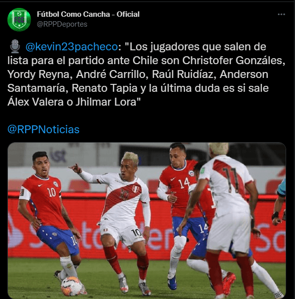 “Los jugadores que salen de lista para el partido ante Chile son Christofer Gonzáles, Yordy Reyna, André Carrillo, Raúl Ruidíaz, Anderson Santamaría, Renato Tapia y la última duda es si sale Álex Valera o Jhilmar Lora”.