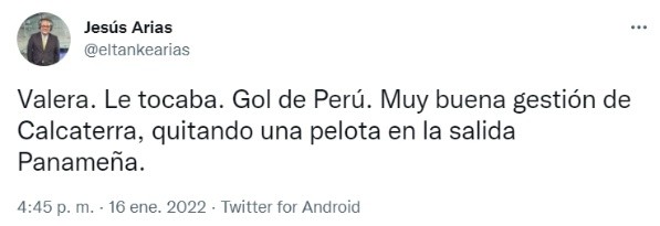 En el minuto 37, la Selección Peruanase puso adelante en el marcador tras un gol de Alex Valera. El periodista Jesús el ‘Tanke’ Arias publicó en su cuenta de Twitter celebrando la conquista de la ‘bicolor’: “Valera: Le tocaba. Gol de Perú. Muy buena gestión de Calcaterra. Quitando una pelota en la salida panameña”, publicó el narrador deportivo.