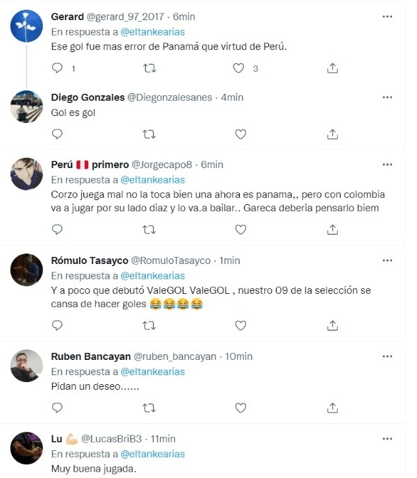 Tras la publicación de El ‘Tanke’,los hinchas de la Selección Peruana reaccionaron haciendo hincapié en el error de los panameños a la hora de salir jugando: “Ese gol fue más error de Panamá que virtud de Perú”, “Pésima definición de Calcaterra”, fueron algunos comentarios de los aficionados tras el tanto marcado por el delantero de Universitario de Deportes.