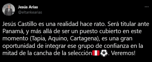 “Jesús Castillo es una realidad hace rato. Será titular ante Panamá, y más allá de ser un puesto cubierto en este momento (Tapia, Aquino, Cartagena), es una gran oportunidad de integrar ese grupo de confianza en la mitad de la cancha de la selección. Veremos”. Fue lo que precisó el relator del canal del fútbol, recibiendo el apoyo de sus seguidores. Bien jugado.