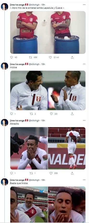 Donde pudimos ver el comienzo de la amistad entre estos dos jugadores fue en Quito, tras el gol de Christian Cueva, con asistencia de Gianluca Lapadula.‘Lapagol’ corrió para abrazar al volante peruano, lanzarlo al suelo y llenarlo de besos en la vibrante celebración, luego de eso hemos visto imágenes de ellos juntos post entrenamientos, en los barriles de hielo y muchas más fotos. Gracias a ello tenemos en Twitter un hilo que ha sido creado por el usuario:@killxhigh