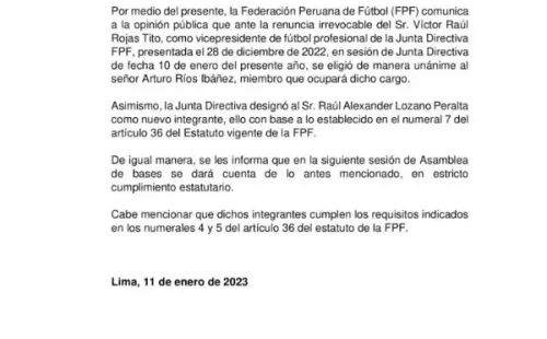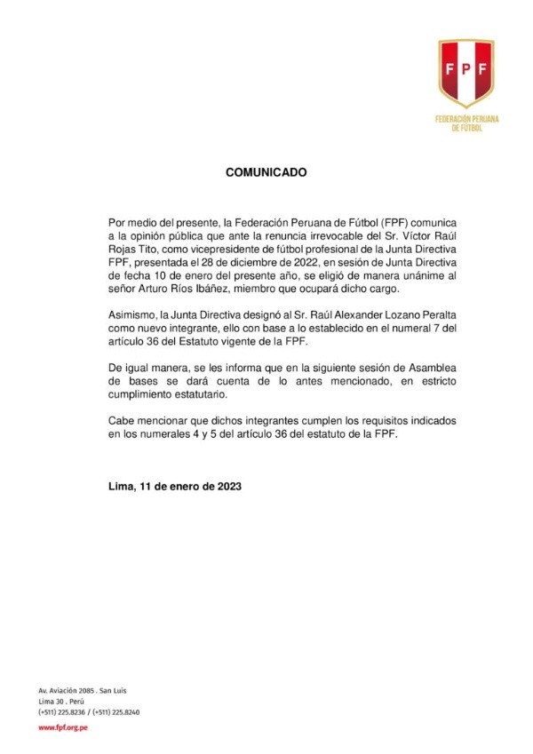 “La Federación Peruana de Fútbol comunica a la opinión pública que, ante la renuncia irrevocable del Sr. Víctor Raúl Rojas Tito como vicepresidente de futbol profesional de la Junta Directiva FPF, se eligió de manera unánime al Sr. Arturo Ríos para ocupar dicho cargo”.