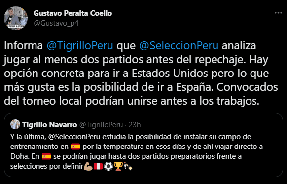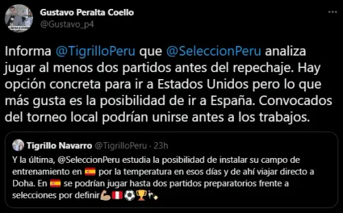 “Informa ‘El Tigrillo Navarro’ que la Selección Peruana analiza jugar al menos dos partidos antes del repechaje. Hay opción concreta para ir a Estados Unidos, pero lo que más gusta es la posibilidad de ir a España. Convocados del torneo local podrían unirse antes a los trabajos”. Propuso en las redes sociales el comunicado de ESPN Perú y Diario Líbero.