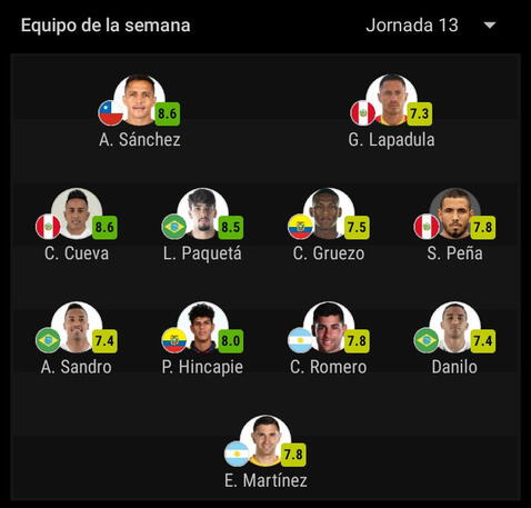 En SofaScore realizaron la conformación de equipo de la fecha en el cual se encuentra los peruanos Christian Cueva, Sergio Peña y Gianluca Lapadula, jugadores que marcaron los goles para la ‘blanquirroja’ en la victoria frente a Bolivia. En este once también se encuentran Emiliano Martínez (Argentina); Danilo (Brasil), Cristian Romero (Argentina), Alex Sandro (Brasil); Carlos Gruezo (Ecuador), Lucas Paquetá (Brasil); Alexis Sánchez (Chile).