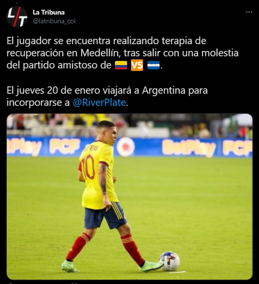 Como lo adelantamos líneas arriba, el malestar nace después del partido amistoso reciente: “El jugador se encuentra realizando terapia de recuperación en Medellín, tras salir con una molestia del partido amistoso de Colombia vs. Honduras. El jueves 20 de enero viajará a Argentina para incorporarse a River Plate”. Una buena para nosotros sin duda alguna.