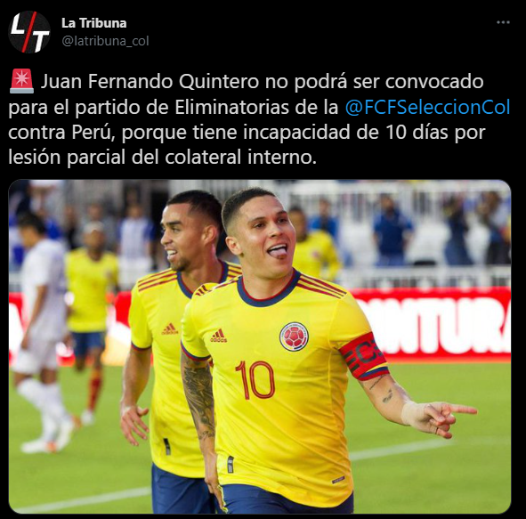 “Juan Fernando Quintero no podrá ser convocado para el partido de Eliminatorias de la Selección Colombia contra Perú, porque tiene incapacidad de 10 días por lesión parcial del colateral interno”. Ese es el informe que brinda la prensa ‘cafetera’ con respecto al crack ex Porto.