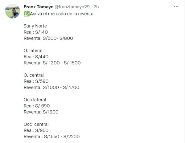 El no poder conseguir entradas, para muchos hinchas, ha llevado a que las reventas sean la única forma de conseguir un boleto para ingresar al estadio Nacional. El periodista Franz Tamayo habló sobre ello en su cuenta de Twitter: “Los precios para la reventa del Perú vs Paraguay son increíbles. Más allá de los revendedores, ha ‘hinchas’ que están abusando de la trascendencia del partido”, publicó en el comunicador en su red social.